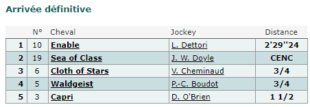 Ou encore quand Enable monté par Lanfranco Dettori bat Cloth of Stars monté par Mickaël Barzalona :